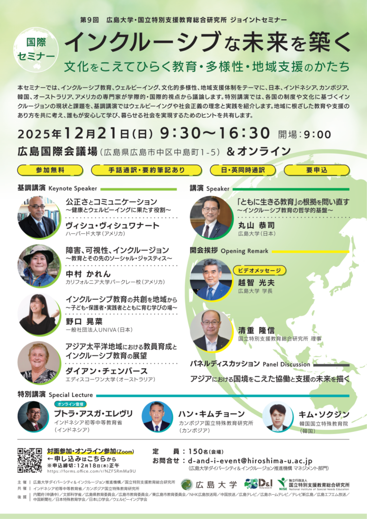 第9回広島大学・特総研ジョイントセミナー「インクルーシブな未来を築く:文化をこえてひらく教育・多様性・地域支援のかたち」のご案内