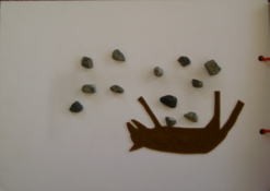 | <絵の説明> (1)ページの中央にあかずきんが正面を向いて立っている絵(頭にずきんとして三角形のビロードの布を貼ってある。高さ7cm)。 (2)左側にあかずきん、右側に母親(その身体にはエプロンとして他と区別できる素材の布を貼ってある。高さ10cm)がいて、向かい合っている絵。 (3)左側にあかずきん、右側にオオカミの絵(毛の素材。大きさ8cm×12cm)。 (4)左側に花を一本持ったあかずきん(右向き)、右側に5本の花を間を空けて並列。 (5)ベッド(長方形の木の板、3cm×12cm)にふとん(長方形の布の素材をベッドの上に)をかけて寝ているおばあさん(顔だけふとんから出ていて、つるつるの布の帽子をつけている)の絵(その周囲を家を示す輪郭線で囲んである)。 (6)ベッド、ふとん、家の輪郭線は先のページと同じで、顔の部分だけがオオカミになっている絵。 (7)台紙いっぱいにオオカミの顔(大きな耳。目と口は大きくくりぬいて地の台紙を露出。15cm大)と、左右下にオオカミの手(5cm大)。 (8)左側に仰向けに寝ているオオカミ(お腹を非常に大きく長円状にふくらませてある)、右側に狩人(服の部分を皮の素材、手に鉄砲を持っている、鉄砲の素材はざらざらのプラスチック。高さ10cm)。 (9)左側にあかずきん、右側におばあさん(高さ10cm)。 (10)仰向けに寝ているオオカミ(お腹は平らになっている)、その上に石(実物の小石)を散在させて貼りつけた絵。 (11)左側にあかずきん、右側におばあさん、二人の真ん中にテーブル(木の素材、5cm×7cm)、その上にワインのビンとお菓子(ワインのビンはつるつるのプラスチック、お菓子は厚紙)。 |