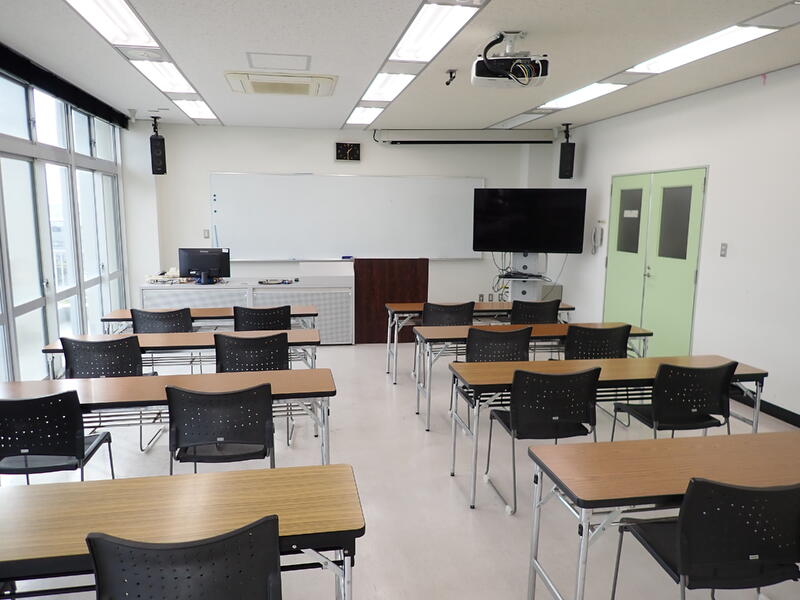 第5研修室:プロジェクター、マイク・スピーカー、大型モニター、ホワイトボード、長机(10台)、椅子(30脚)