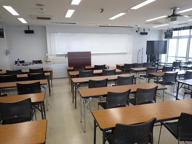 講堂:プロジェクター、マイク・スピーカー、大型モニター、ホワイトボード、演台、固定座席(151席)、椅子(20脚)