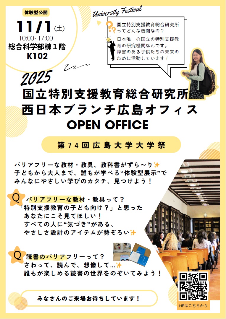 2025年度第74回広島大学大学祭に出展します 2025年10月3日 過去のお知らせ 現在位置 ホームお知らせお知らせ20252025年度広島大学大学祭に出展します 第74回広島大学大学祭に国立特別支援教育総合研究所西日本ブランチ広島オフィスが出展します! みんなにやさしいバリアフリーな教材・教具、教科書などを展示します。子供から大人までみんなに優しい学びのカタチがきっと見つかります。 皆様のご来場を心よりお待ちしています! 日時 2025年11月1日(土)10:00ー17:00 会場 広島大学総合科学部棟1階K102 〒739-8521 東広島市鏡山一丁目7番1号 詳細は広島大学大学祭HPから。(外部リンクへつながります。) 画像クリックで拡大表示 PDFダウンロード