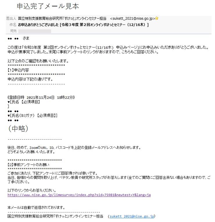 6)申込完了の自動返答メールの見本 [119K jpgファイル] ※タイトル等は第3回の内容に変更されます
