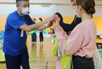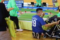 誰もが主役になれる「ユニバーサル野球」。野球のルールや技術だけでなく、コミュニケーションやチームワークの大切さを体感できる企画を堀江車輛電装株式会社の協力を得て体育館で実施しました。バスケットボールコート半分弱程度の野球盤を設置し、タイミングを合わせてボールをはじくことで、野球ゲームに参加できるユニバーサル野球は、誰もが参加しやすく、また、周囲からの応援により参加者の気持ちも盛り上げることができていました。応援は、横須賀市立横須賀総合高等学校からボランティアスタッフとして参加の生徒たちにウグイス嬢や太鼓などを分担して、体験会を盛り上げていただきました。