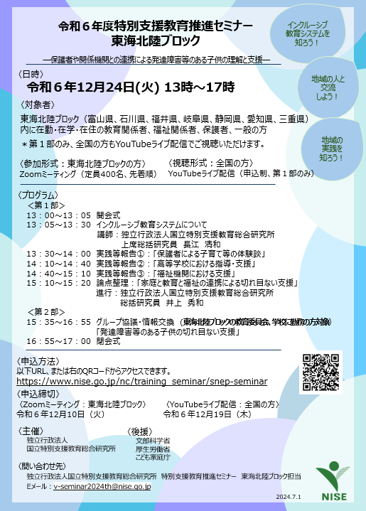 対象者:東海北陸ブロック(富山県、石川県、福井県、岐阜県、静岡県、愛知県、三重県)の教育関係者、福祉関係者、保護者、一般の方