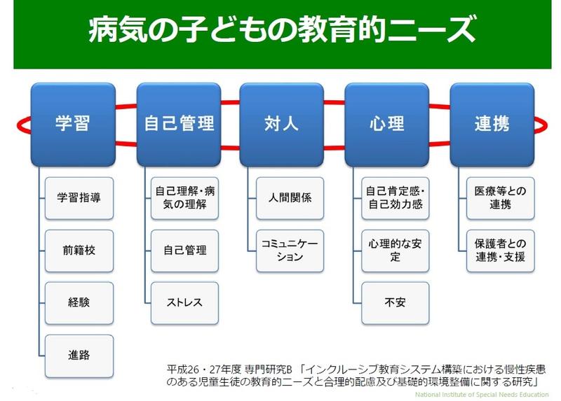 病気のある児童生徒の実態把握や研修会、学校での実践等にてご活用ください。- 病気のある児童生徒の教育的ニーズ